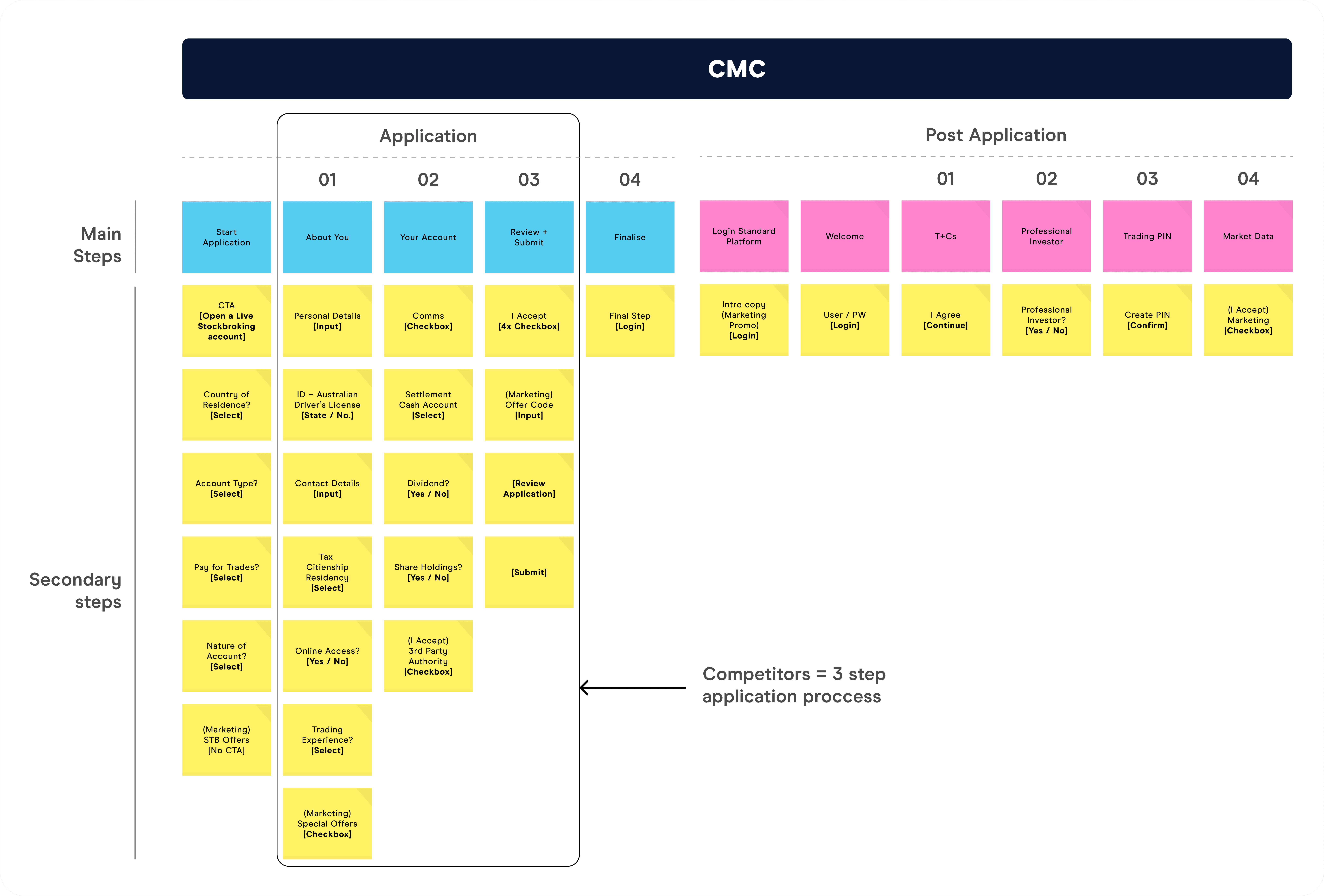Above image: Shows 10 main steps during and post application process. After step 02, the customer would've been asked to complete 18 fields. 3 main steps was identified among competitors. This cognitive load for users was identified as a pain point and critical drop-off point in the process which drove customers to seek competitors with a more seamless application process.
