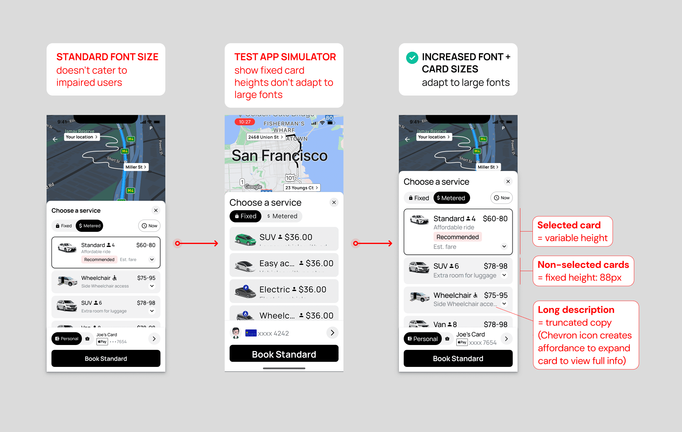 No clearly defined visual hierarchy for CTAs (call-to-action) or accessibility standards were implemented which caused frustration for impaired users wanting to pre-book a ride and pay quickly and easily.